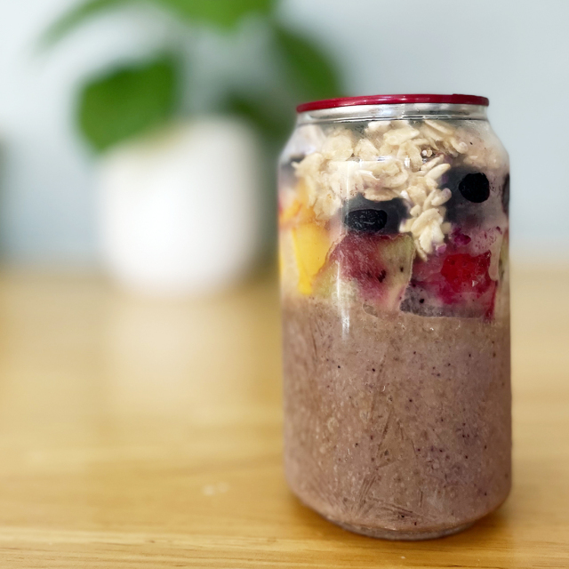 急速冷凍したバナナ、ブルーベリー、いちご、キウイフルーツ、マンゴーの5つのフルーツとビタミン、ミネラル、食物繊維を多く含むオーツ麦をトッピング。